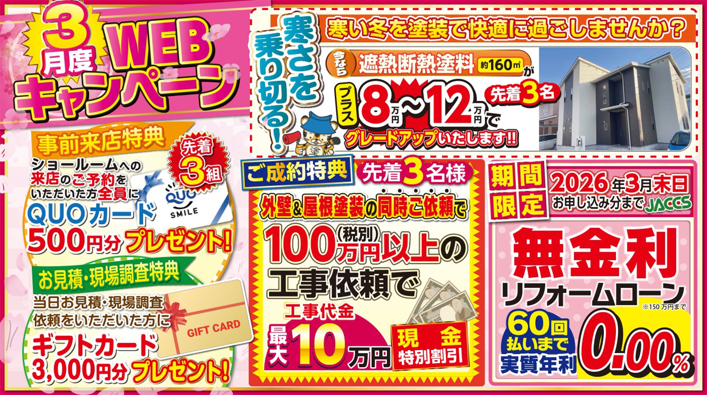 外壁塗装専門店の杉本建装工業では、3月WEB限定の特別キャンペーンを開催中!