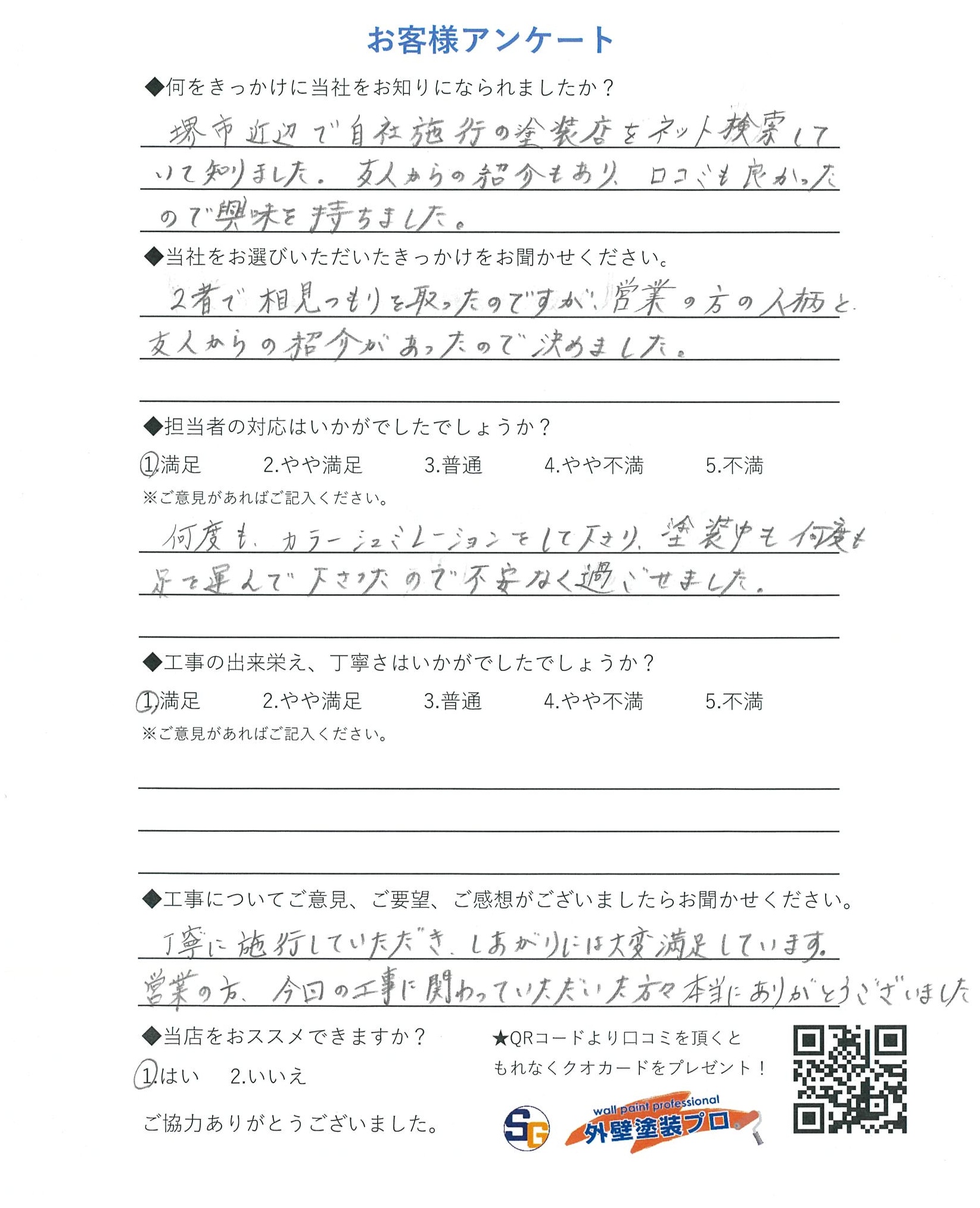 堺市近辺で自社施工の塗装店をネット検索していて知りました。友人からの紹介もあり、口コミもよかったので興味を持ちました。