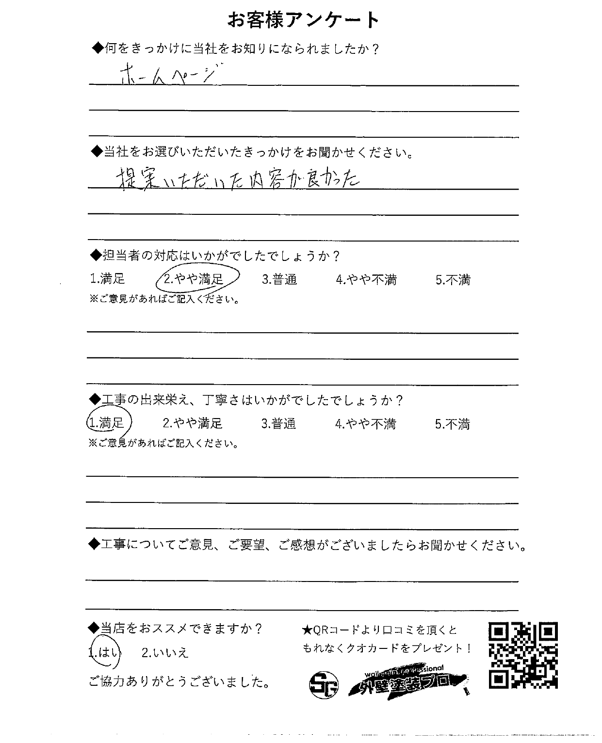 和泉市でリフォームをされたT様の声 見積りに来ていたた時の丁寧な説明と対応 何をきっかけに当社をお知りになられましたか? ホームページ 当社をお選びいただいたきっかけをお聞かせください。 提案いただいた内容が良かった 担当者の対応はいかがでしたでしょうか? やや満足 工事の出来栄え、丁寧さはいかがでしたでしょうか? 満足 当店をおすすめできますか? はい いいえ ORDER このお客様の施工内容 やさしいブラウンで、街並みになじむ外観へ クラシック外壁塗装戸建て住宅大阪府堺市 前の記事 次の記事 一覧へ戻る