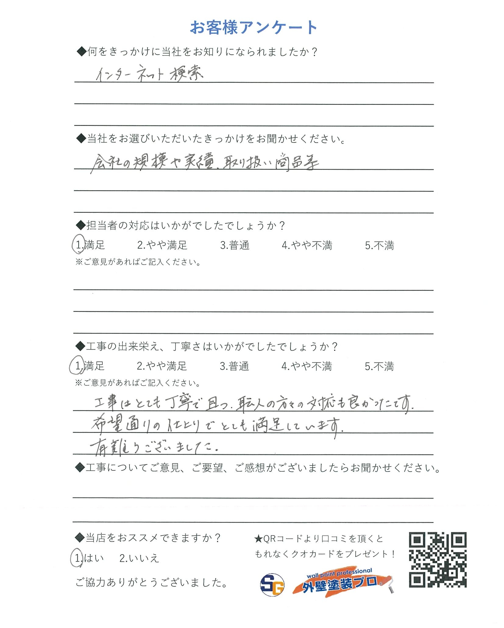 堺市西区でリフォームをされたN様の声 丁寧で希望通りの仕上がり! 何をきっかけに当社をお知りになられましたか? インターネット検索 当社をお選びいただいたきっかけをお聞かせください。 会社の規模や実績、取り扱い商品等 担当者の対応はいかがでしたでしょうか? 満足 工事の出来栄え、丁寧さはいかがでしたでしょうか? 満足 工事はとても丁寧で且つ職人の方々の対応も良かったです。 希望通りの仕上りでとても満足しています。 有難うございました。 当店をおすすめできますか? はい いいえ ORDER このお客様の施工内容 前の記事 一覧へ戻る