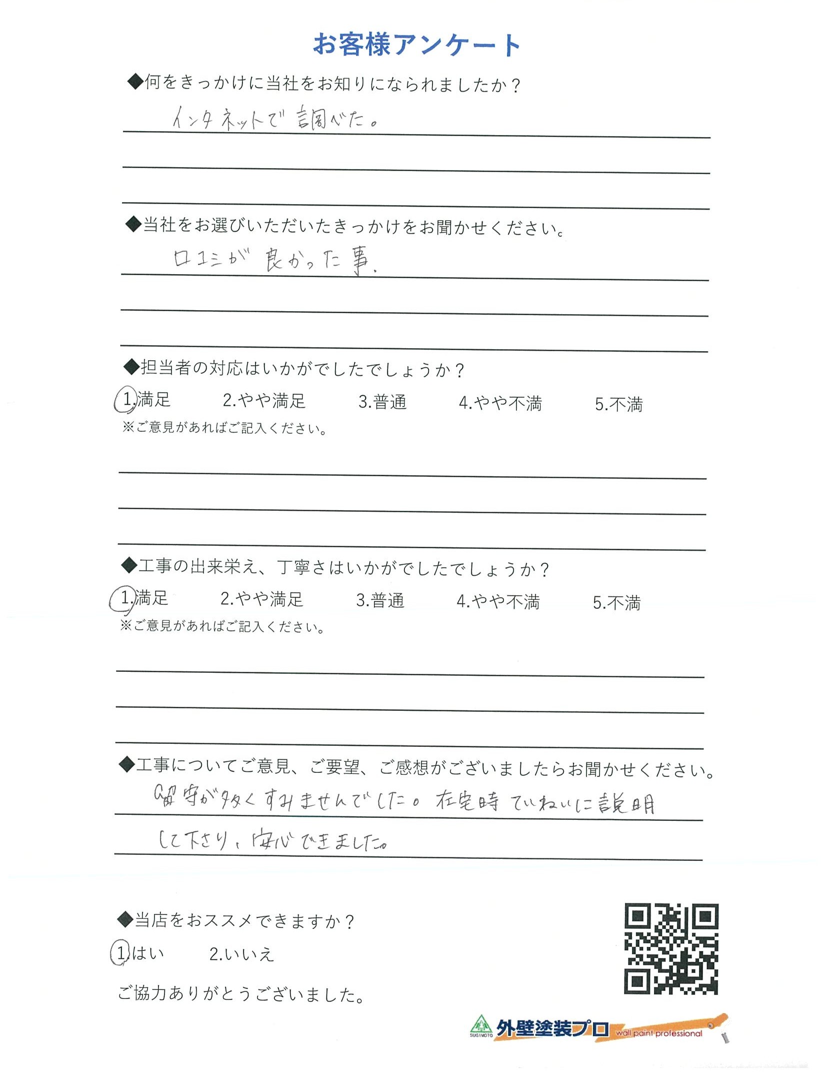 堺市西区浜寺石津東でリフォームされたK様の声 ていねいに説明してくださり、安心できました。 何をきっかけに当社をお知りになられましたか? インターネットで調べた 当社をお選びいただいたきっかけをお聞かせください。 口コミが良かった事。 担当者の対応はいかがでしたでしょうか? 満足 工事の出来栄え、丁寧さはいかがでしたでしょうか? 満足 工事についてご意見、ご要望、ご感想がございましたらお聞かせください。 留守が多くすみませんでした。 在宅時ていねいに説明して下さり、安心できました。 当店をおすすめできますか? はい いいえ ORDER このお客様の施工内容 大きく印象は変えず、上品なベージュで清潔感ある外観へ。 屋根塗装外壁屋根塗装外壁塗装ベランダ防水戸建て住宅サンユー都市開発大阪府堺市ナチュラル系ライト系 前の記事 次の記事 一覧へ戻る