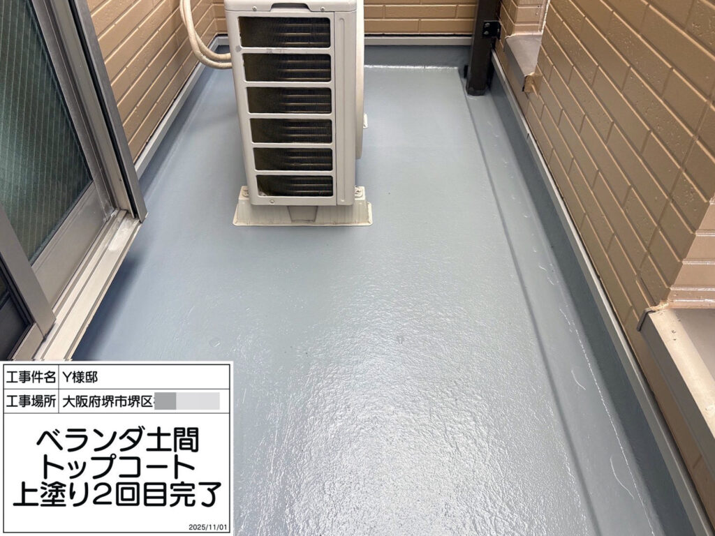 バルコニーは新しい防水層と下地を密着させるために脱脂を行います。塗りムラなく丁寧に仕上げることで、耐水性・耐久性を高めることができます。