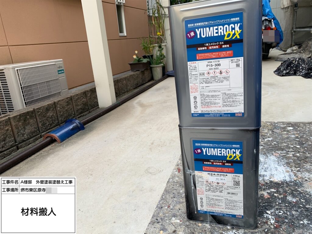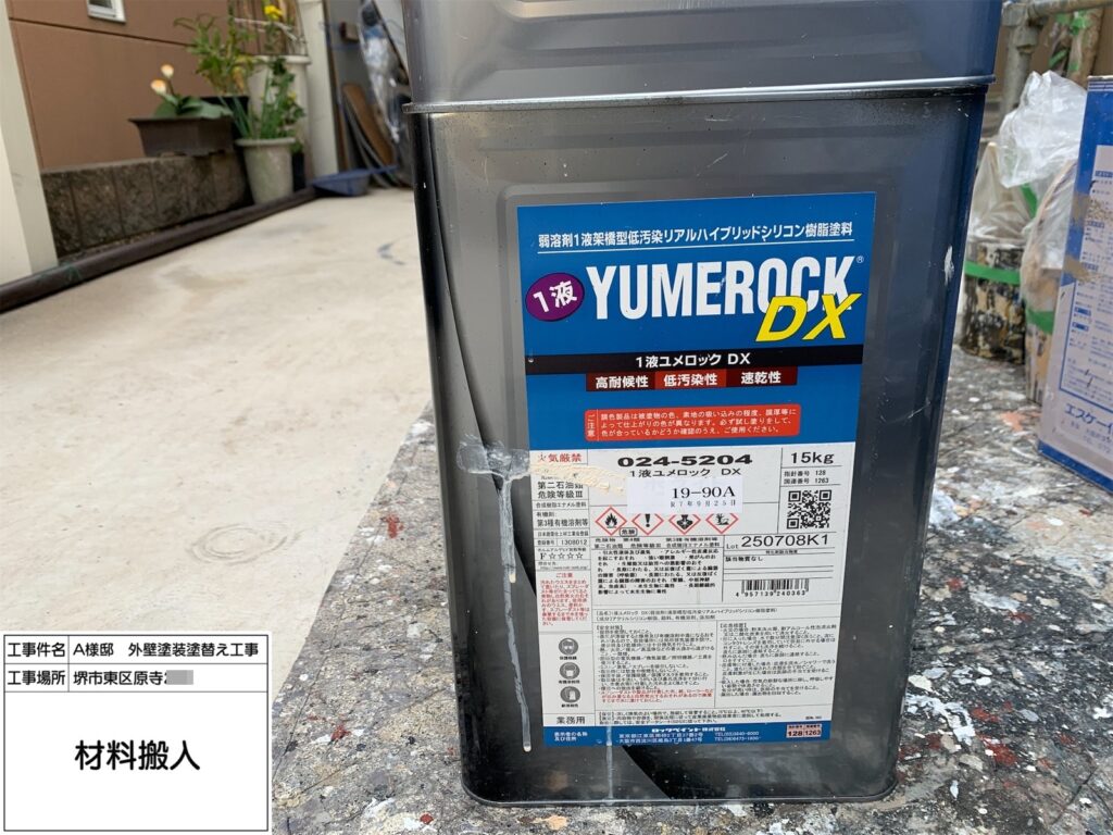 SK化研「プレミアム無機」は、無機塗料ならではの高耐久性があり、紫外線や雨風による劣化を抑えて長く美観を保てるため、今回こちらをお勧めしました。SR-109は落ち着いたライトグレー系で、汚れが目立ちにくく、どんな外観にも馴染む万能色です。また、低汚染性・防カビ防藻性能にも優れているため、黒ずみや緑汚れが付きにくく美しさを長期間維持できます。メンテナンスサイクルを伸ばせる点も大きなメリットです。