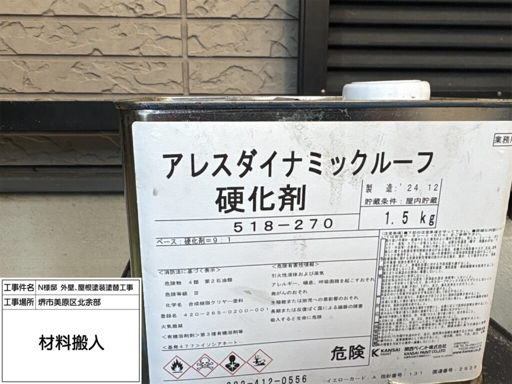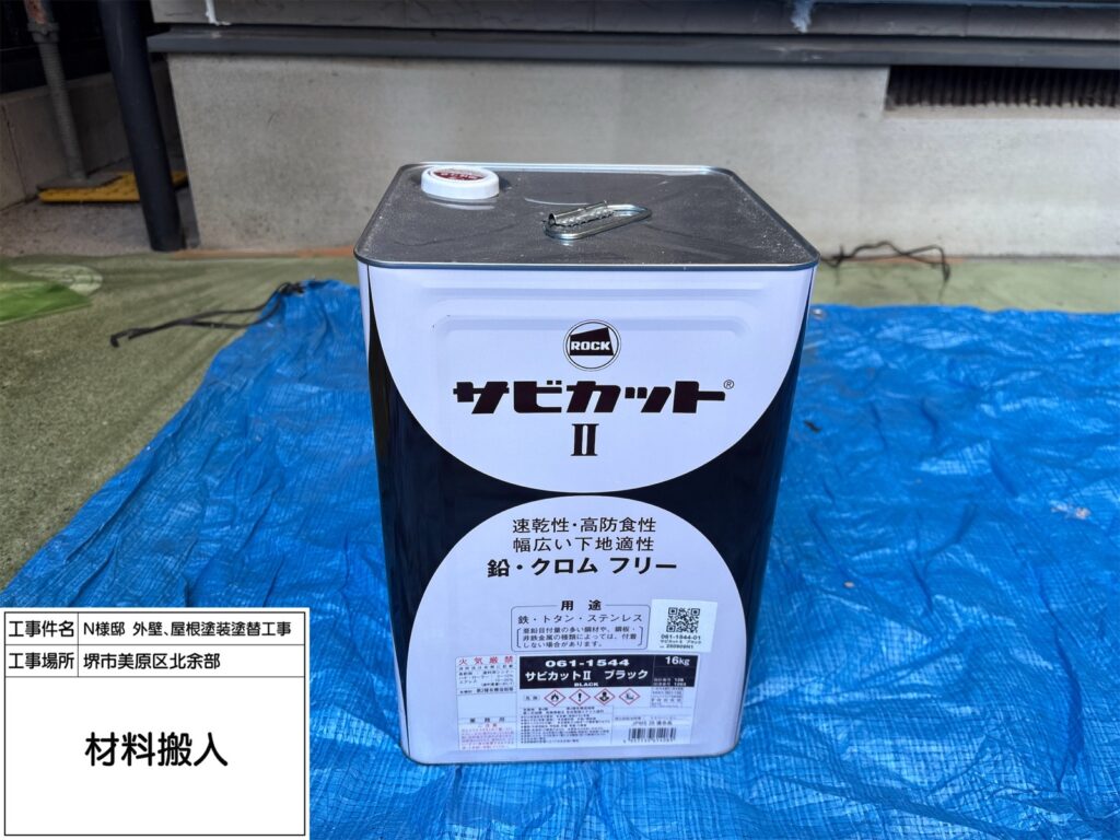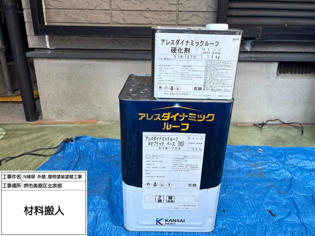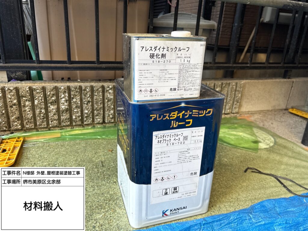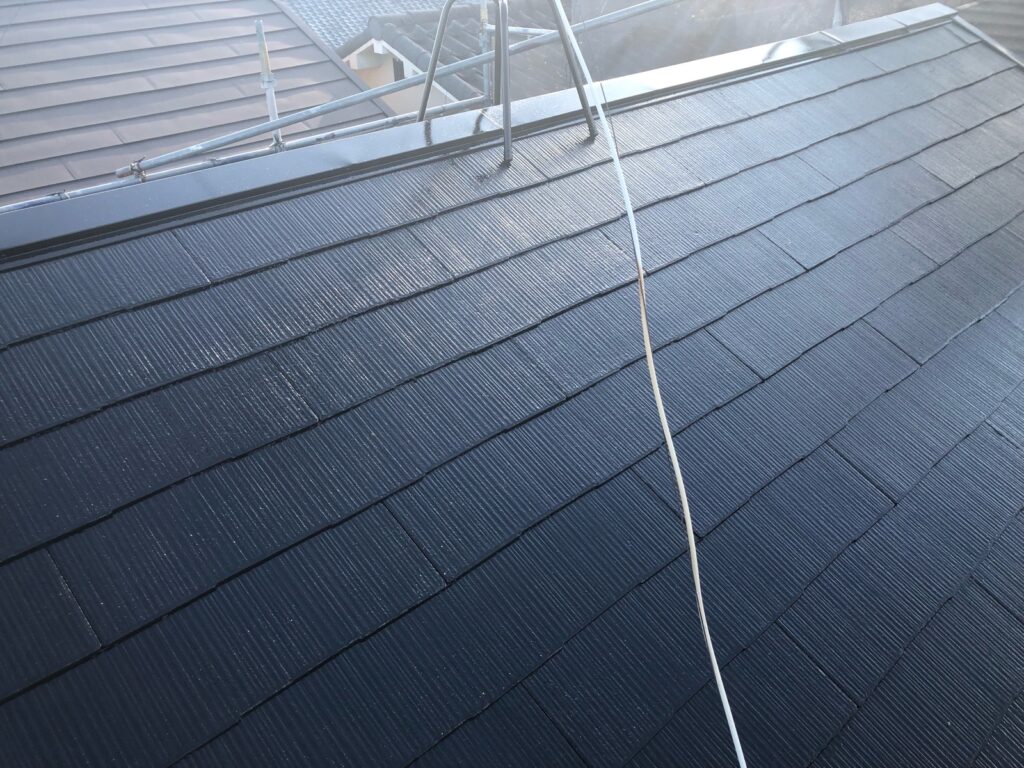 屋根にご提案したダイナミックルーフは高い耐候性を持ち、紫外線や雨風を長期間しっかり防ぐ屋根用塗料です。ネオブラックは落ち着いた濃色で、屋根全体を引き締め重厚感のある外観に仕上がります。優れた密着性で塗膜がはがれにくく、防水性も向上。色あせしにくいため、美しい仕上がりを長く保てるのも特長です。築年数が経った屋根の保護と美観維持に適しています。